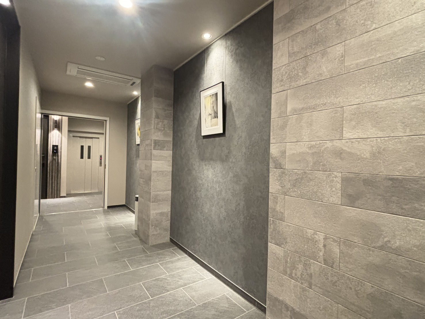 ⇩共用廊下(奥にエレベーター)