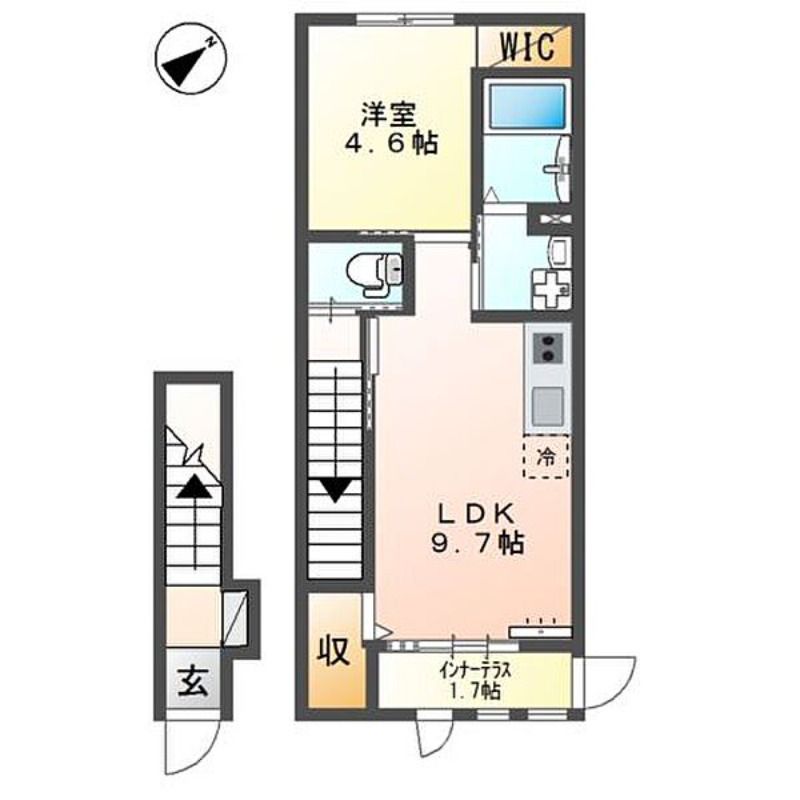 築年月 2025年  間取り 1LDK( LDK9.7畳/洋室4.6畳(*階) ) 専有面積 43.35m2